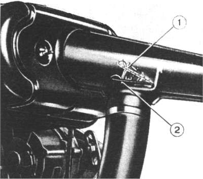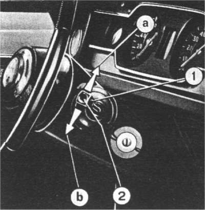 MAR. Azionando la leva (1) nel senso della sterzata che si vuole eseguire (a, indicatore destro; b, indicatore sinistro), si accende la relativa lampada spia sul porta apparecchi; il ritorno della leva avviene automaticamente con il raddrizzamento della guida od a mano in caso di sterzata non eseguita. |