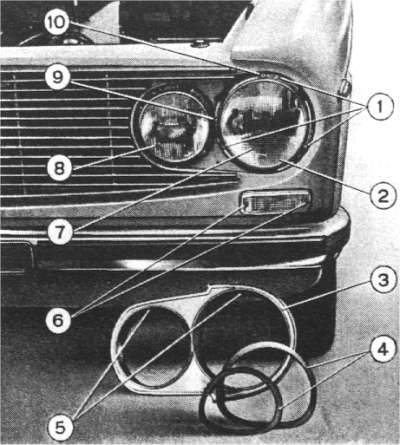 Orientamento proiettori: Si effettua a vettura scarica, posta con i proiettori alla distanza di 10 m da uno schermo verticale. Agire sulle viti registro (9) per l'orientamento del fascio luminoso in senso verticale e (10) per l'orientamento del fascio luminoso in senso orizzontale dei proiettori, dopo aver tolto la cornice esterna (3). Questa operazione è consigliabile farla eseguire da una nostra Officina Autorizzata. |