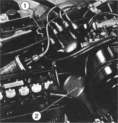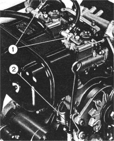 Motore| Filtri carburante: Ogni 7000 km smontarli e pulirli accuratamente con carburante. Quello sulla pompa (2) è accessibile togliendone il coperchio, e quelli sui carburatori (1) staccandone la tubazione d'arrivo carburante. Sostituire se risultassero deteriorati, i filtri e relative guarnizioni. |
