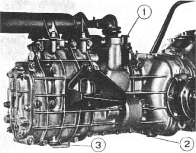 Sostituzione olio: Ogni 14.000 kmsostituire l'olio. Effetuare l'operazione di svuotamento possibilmente a olio caldo, lasciando scolare bene prima di introdurre il nuovo olio. Scarico olio attraverso appositi fori muniti di tappo situati inferiormente nel cambio (3) e nel propulsore (2). Introduzione olio dall'apposito bocchettone munito di tappo con asta livello e sfiato (1). |