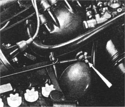 | Scarici liquido: Togliere il tappo a pressione sul radiatore, togliere il tappo del foro di scarico del motore (indicato in figura) ed aprire il rubinetto che comanda il riscaldamento vettura. Togliendo il tappo radiatore a motore caldo, usare la precauzione di svitare il tappo prima parzialmente fino al arresto, lasciando scaricare la pressione e solo dopo svitare totalmente. |